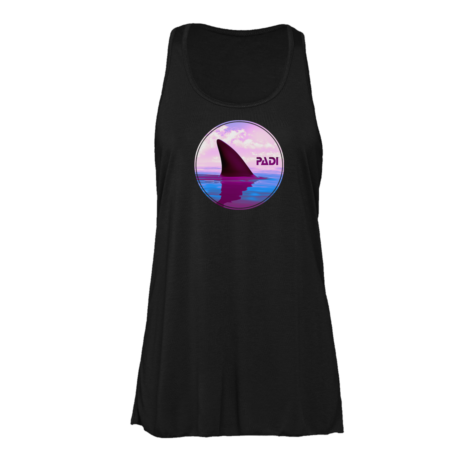 This gorgeous sunset shark fin design shows the beautiful side of a maligned creature. Printed on a universally flattering Bella + Canvas flowy black tank top with a draped silhouette, round neck and racer back, this top is a favorite amongst the PADI Gear team.