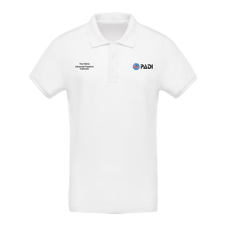This is an exclusive instructor polo with the Padi Logo embroidered on one side of the chest and Advanced Freediver Instructor on the other side.